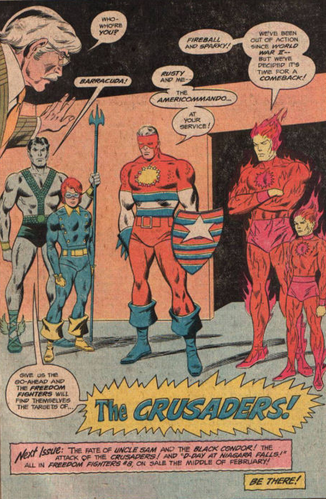 Updated versions of Americomando and Barracuda show up as members of First Strike in "Uncle Sam And The Freedom Fighters #4